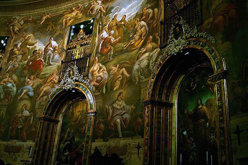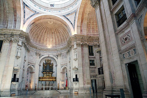 The design of the church represents Portuguese Baroque. The interior is very light and colorful embellished with different types of marble. The main facade includes four huge Tuscan columns, which stand like the protectors of this wonder. The harmonious interior of the church is dominated by the curved spaces of the central crossing and naves. The floor and walls are decorated with baroque, polychrome patterns of marble. The magnificent 18th-century baroque organ was brought from Lisbon Cathedral.