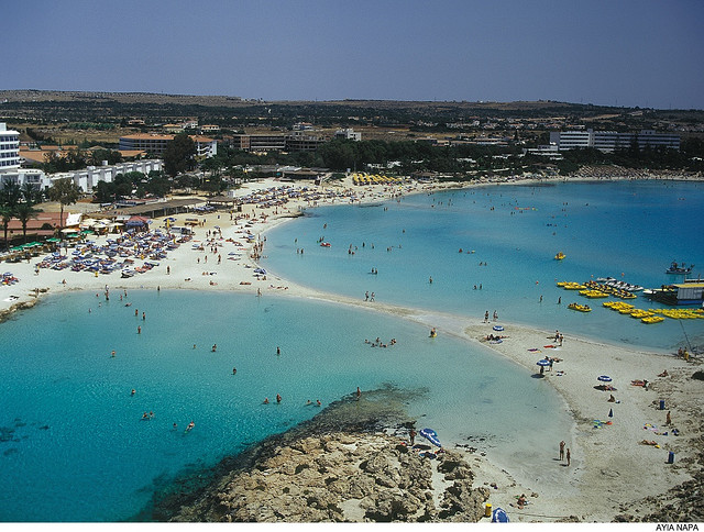 Nissi Beach– Nissi Beach in the Ayia Napa area is an attractive beach with white sand and shallow turquoise waters. There is a small rocky island at one end which you can walk across to and go rock jumping. It’s fair to say this is a party beach with cafes and pubs playing music and people enjoying a beer or two during the day. Attractive boys and girls parade along the beach and adventurous travellers challenge themselves to the bungee jump at the far end.